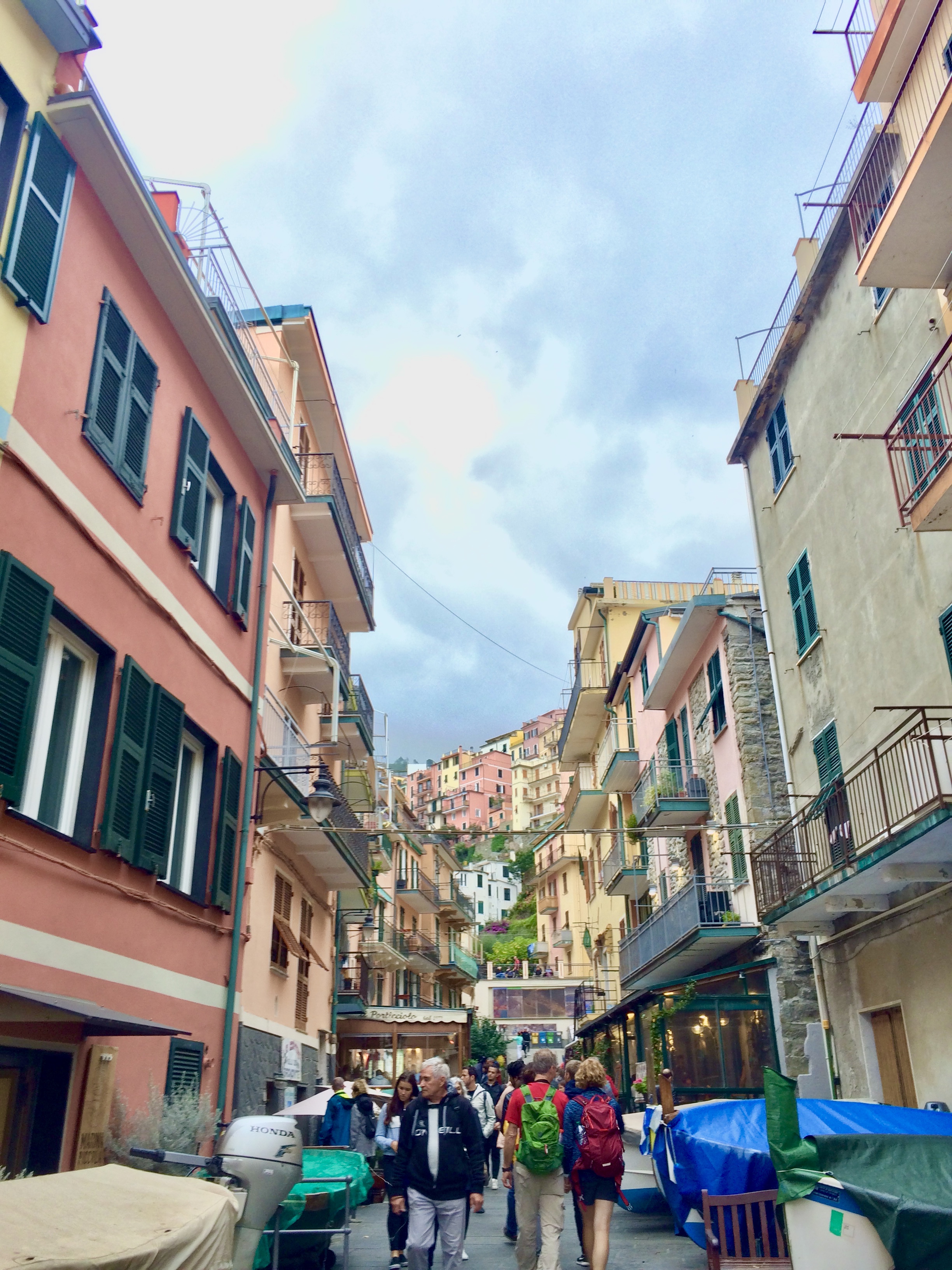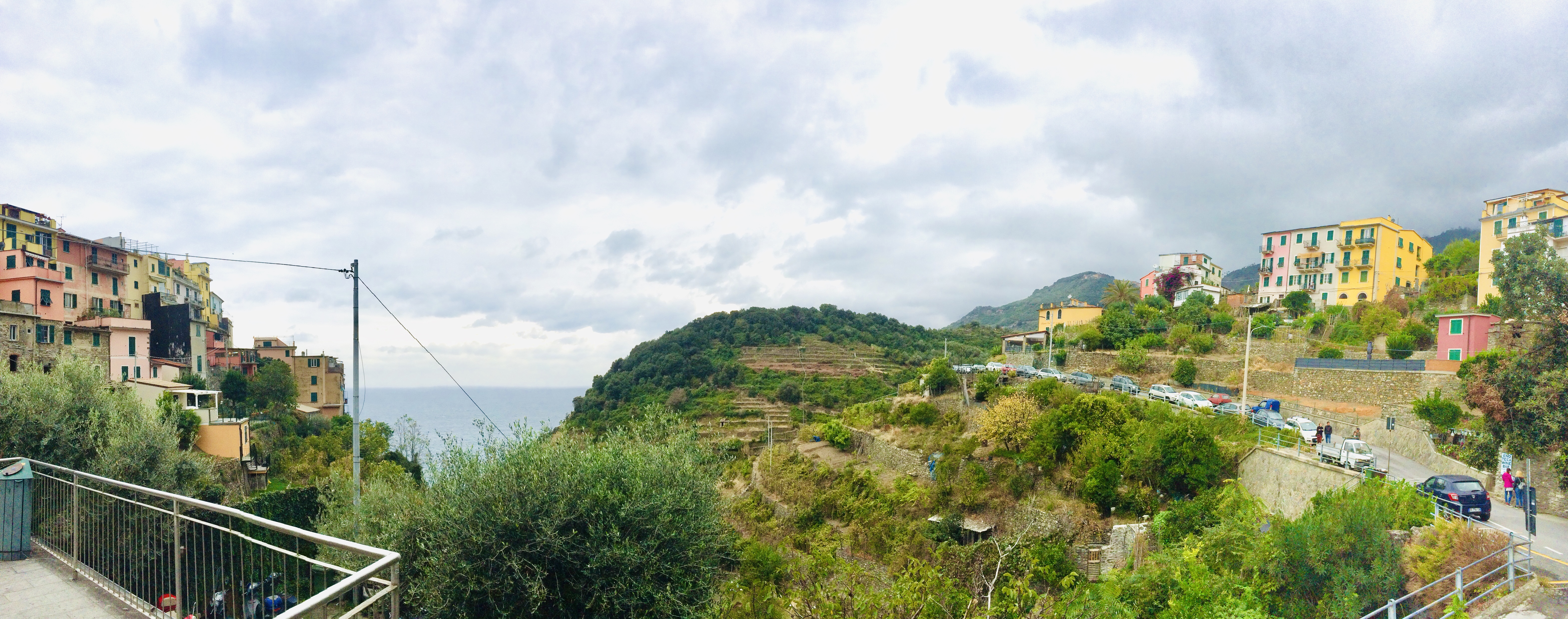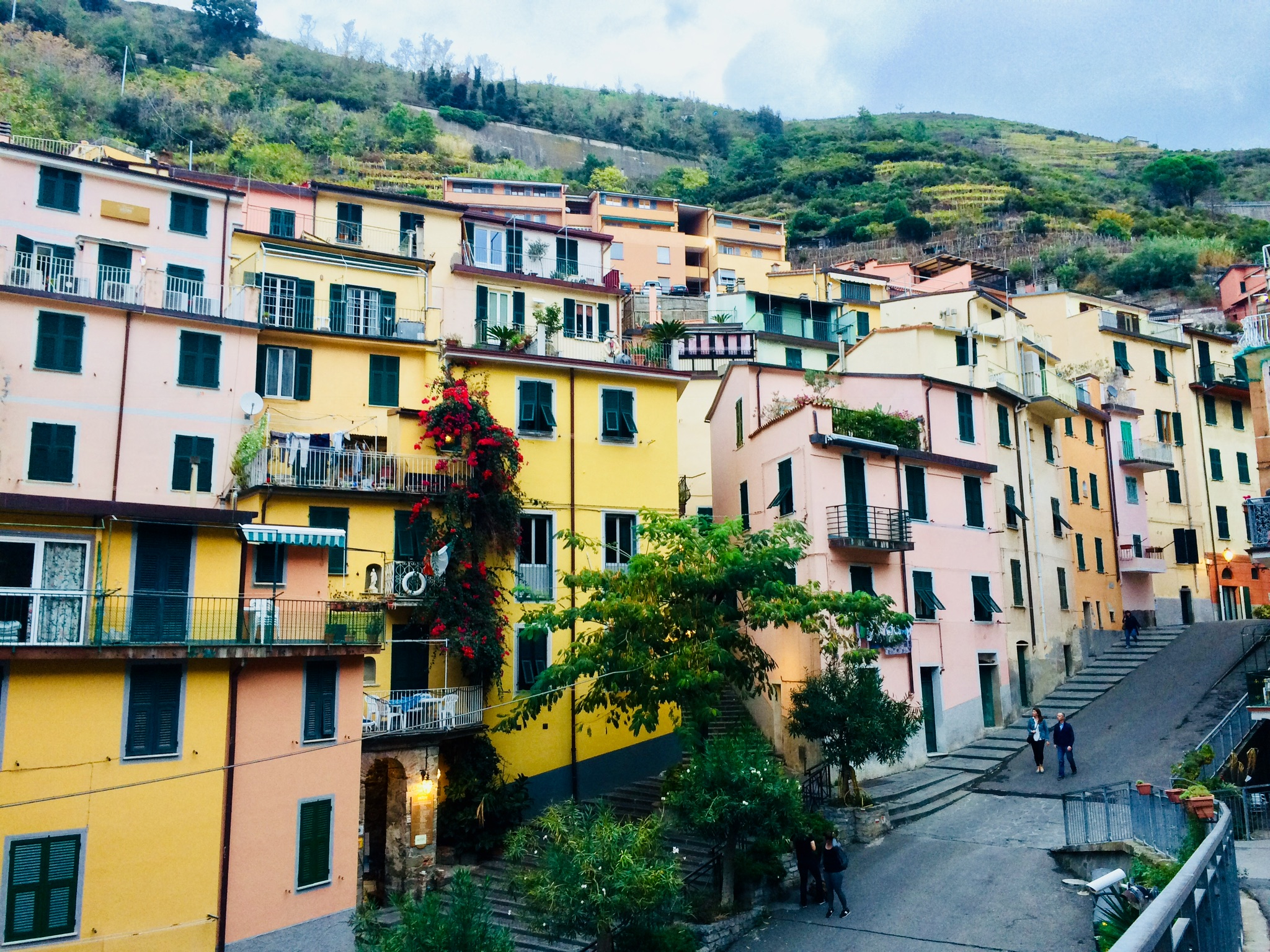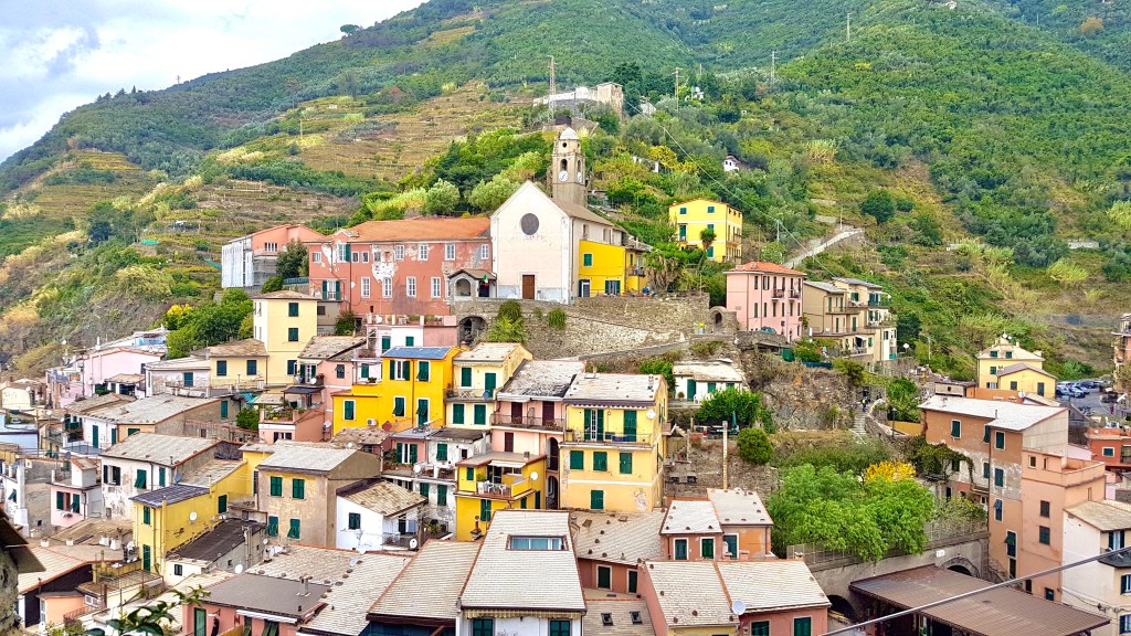 The 20 minutes long scenic train ride to the furthest village took us through picturesque landscapes with pastel colored houses perched on the cliffs and vineyards overlooking the turquoise colored Ligurian coastline.