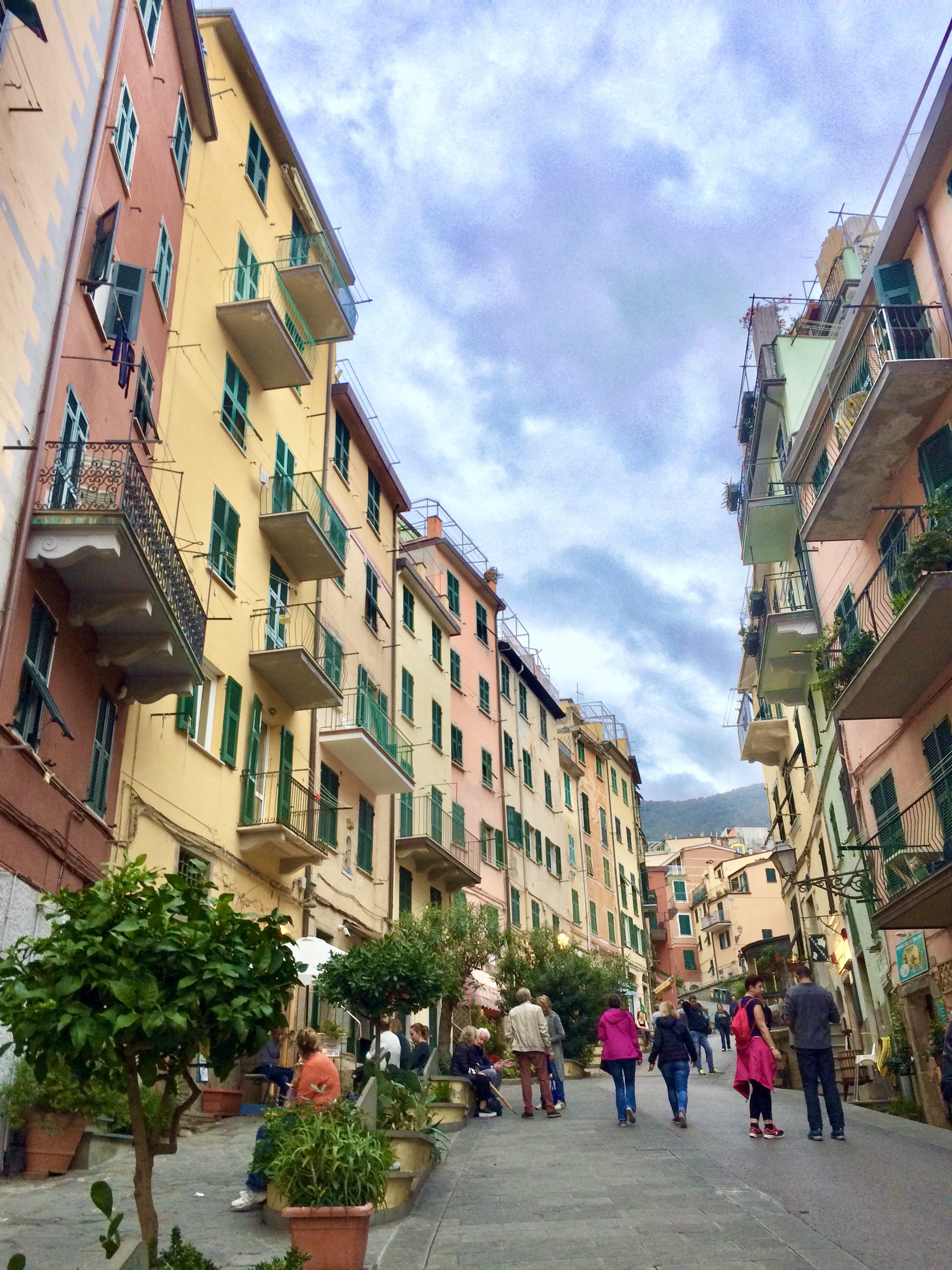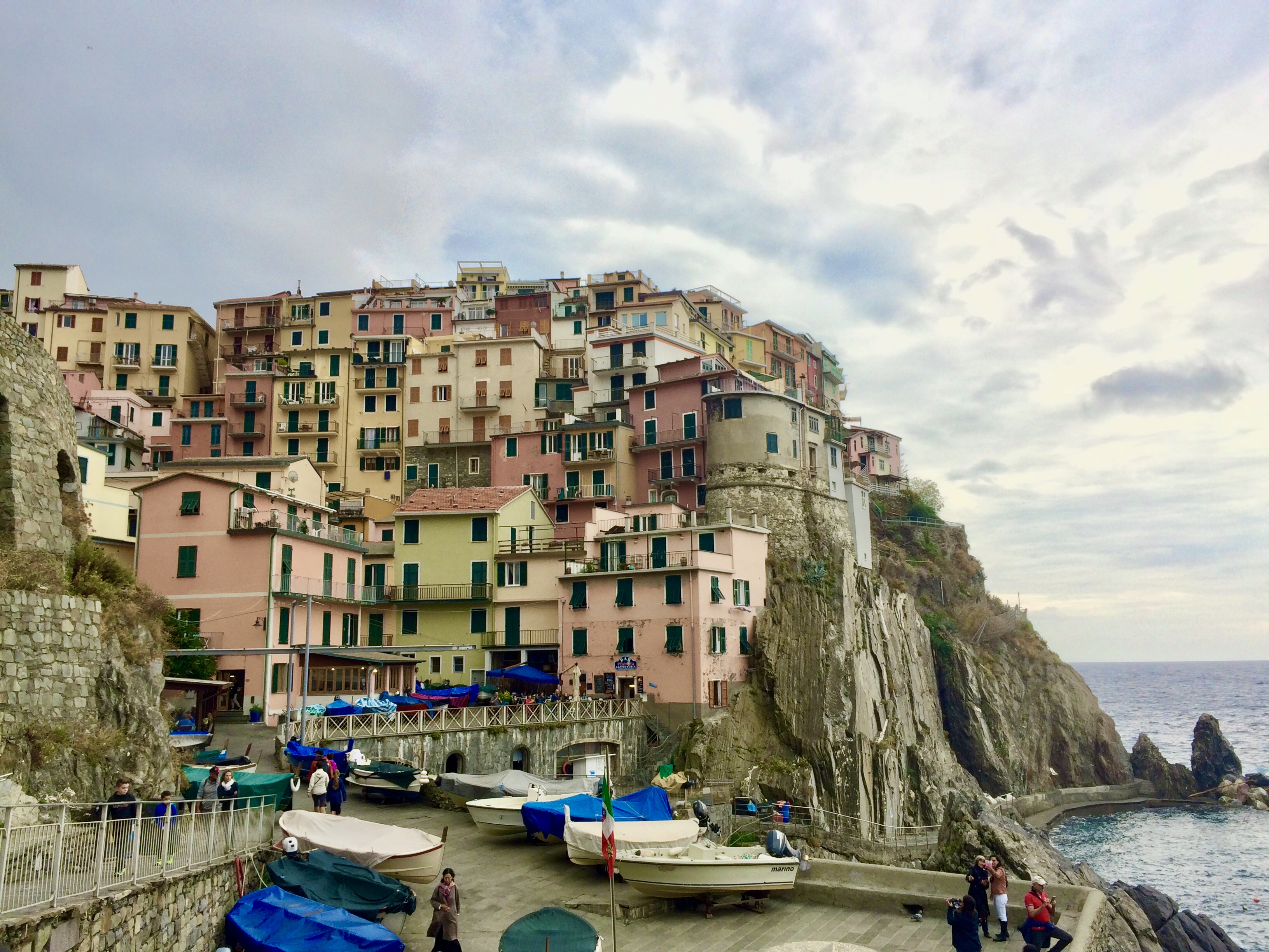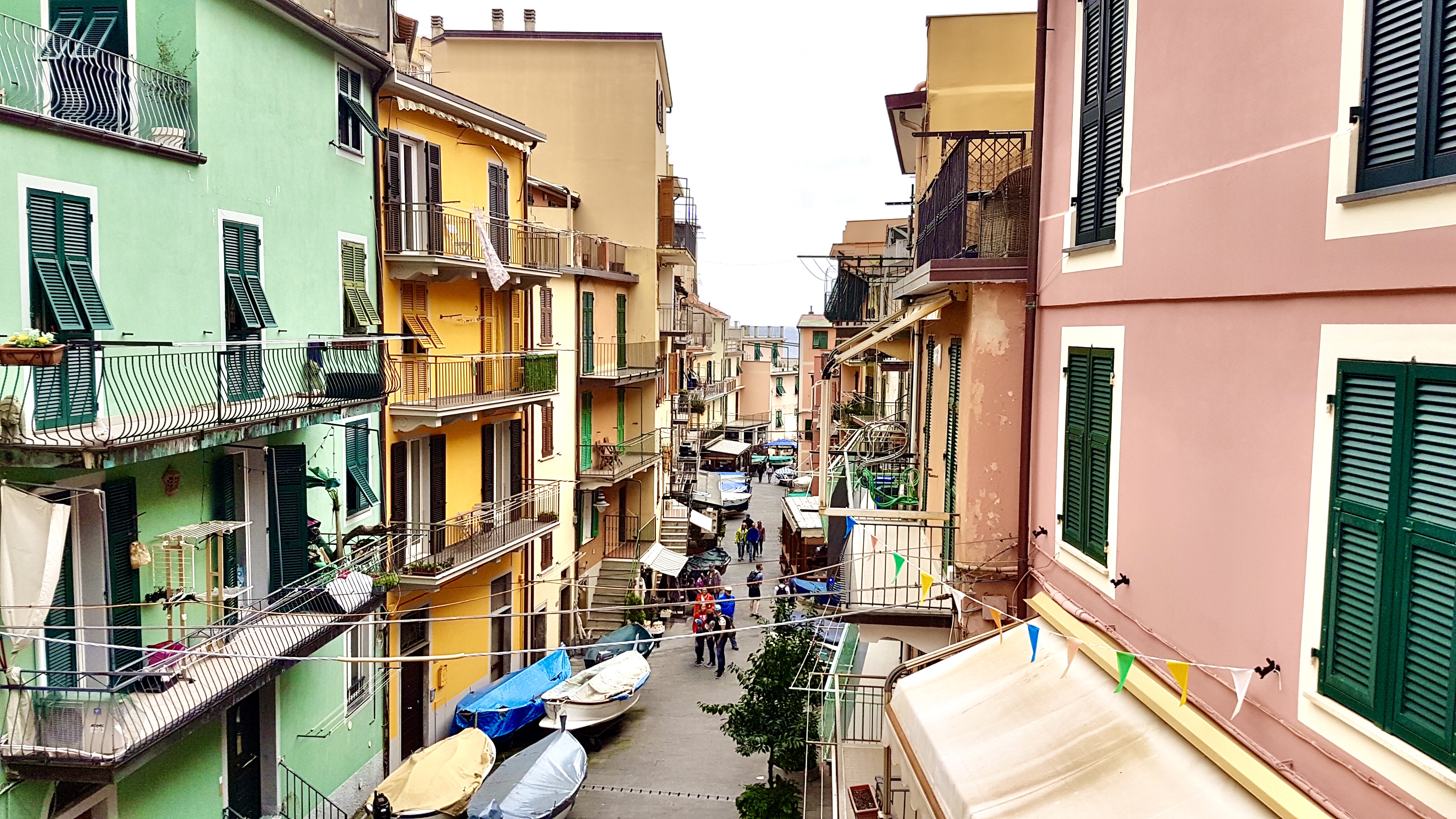 The 20 minutes long scenic train ride to the furthest village took us through picturesque landscapes with pastel colored houses perched on the cliffs and vineyards overlooking the turquoise colored Ligurian coastline.