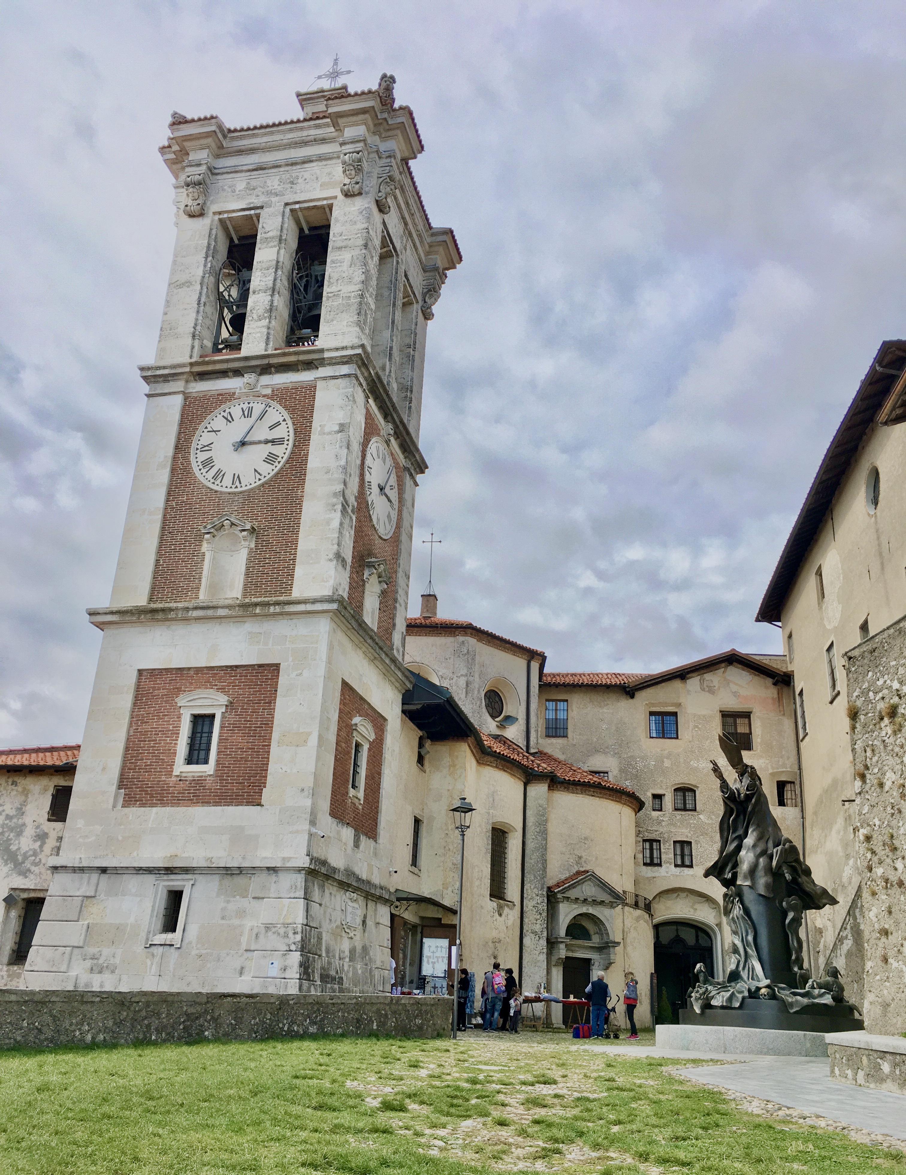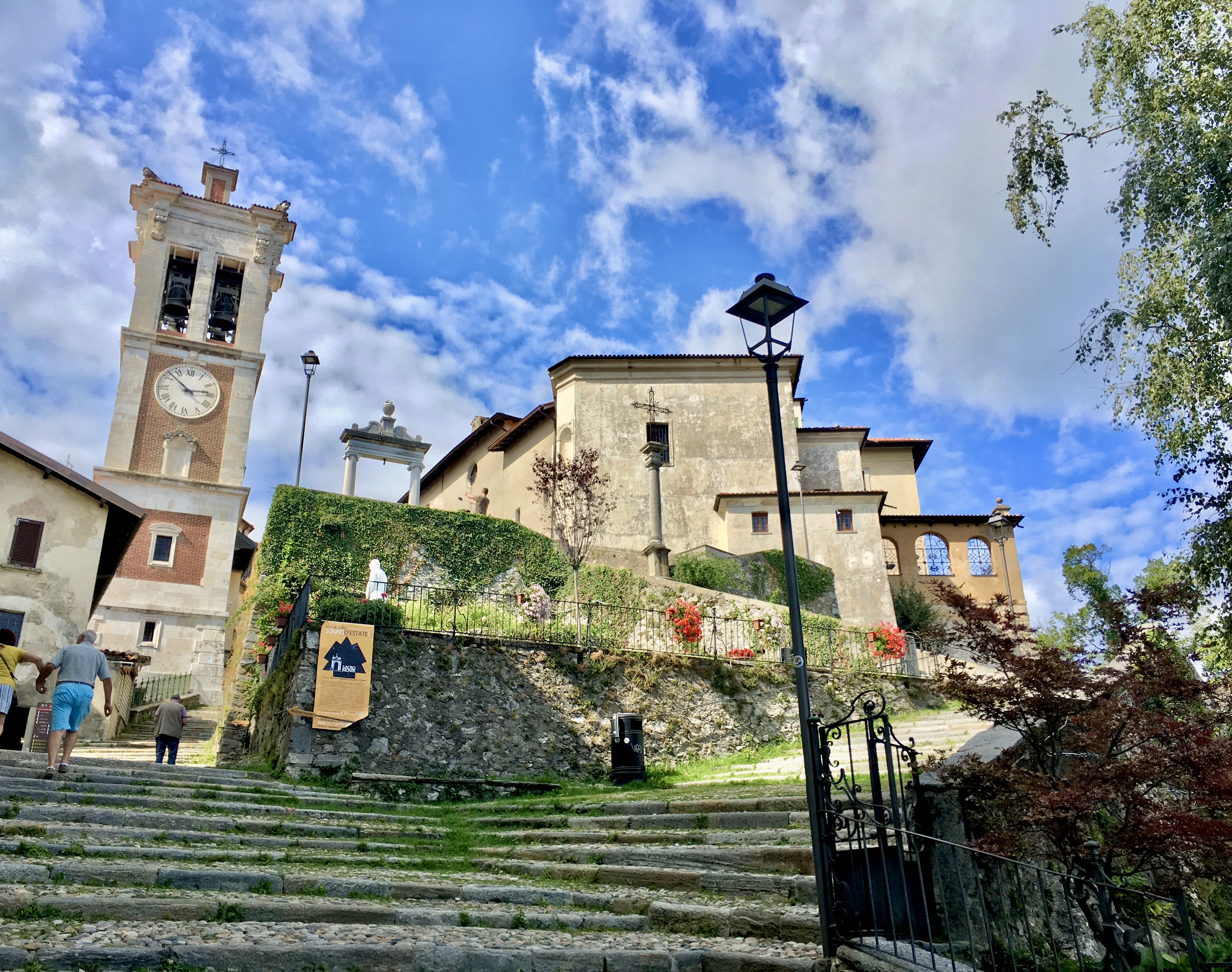 Overlooking the small Piazza Paolo VI stands the Campanile (bellower) and the most important landmark of the village, The Sanctuary of the Santa Maria del Monte, which is the 15th Chapel. The Sanctuary represents the Glorious Mystery of the Coronation of Mary and dates back to the Middle Ages. According to the legend in the 4th century Saint Ambrose built a chapel on the mountain and donated a wooden statue of the Madonna Nera (Black Madonna) after defeating followers of Arian heresy due the intercession by the Virgin.